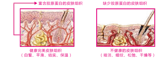一个成年人的身体内约有3公斤胶原蛋白,主要存在于人体皮肤、骨骼、眼睛、牙齿、肌腱、内脏(包括心、胃、肠、血管)等部位,其功能是维持皮肤和组织器官的形态和结构,也是修复各损伤组织的重要原料物质。在人体皮肤成分中,有70%是由胶原蛋白组成。当胶原蛋白不足时,不仅皮肤及骨骼会出现问题,对内脏器官也会产生不利影响。也就是说,胶原蛋白是维持身体正常活动所不可缺少的重要成分。同时也是使身体保持年轻、防止老化的物质。另外,胶原蛋白还可以预防疾病,改善体质,对美容和健康都很有帮助。现在胶原蛋白正慢慢进入美容护肤领域,如下图示当真皮层的胶原蛋白(下图黄色部分)被氧化、断裂后,对表皮的支撑作用就消失了,因此造成不均一的塌陷,这样皱纹就产生了。